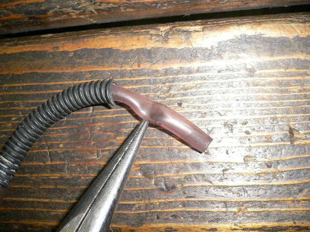 しかも、チョークケーブルとエンジンハンガーに挟まれて、潰れてます。おそらく、原因は、これでしょう。
