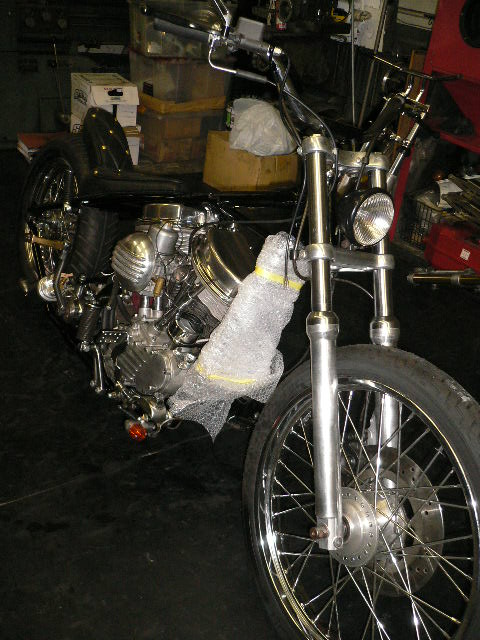 お待たせしている、panhead customのフレームが塗装(パウダーコート)から帰ってきたので、とりあえず前後の足廻りを組み付けて、取り回し出来るようにしました。フレーム以外の塗装はもうしばらくお待ちください。