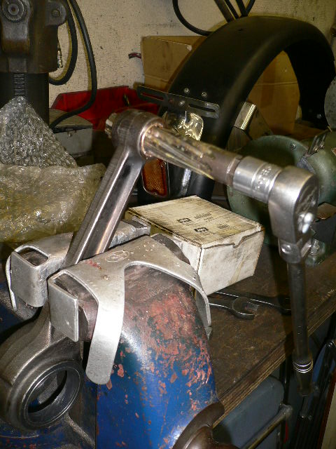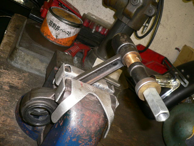 コンロッドスモールエンドのブッシュを交換、リーミング中の写真です。
