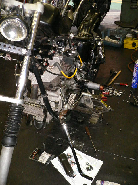 ご注文をいただいた、リジットショベルのベース車両が入荷しました。早速、外装、マフラー、キャブ、エンジン、ミッションを降ろしていきます。