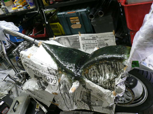 FRPでシートベース製作中です。準備と後かたずけがたいへんなんです。チクチクするし。
