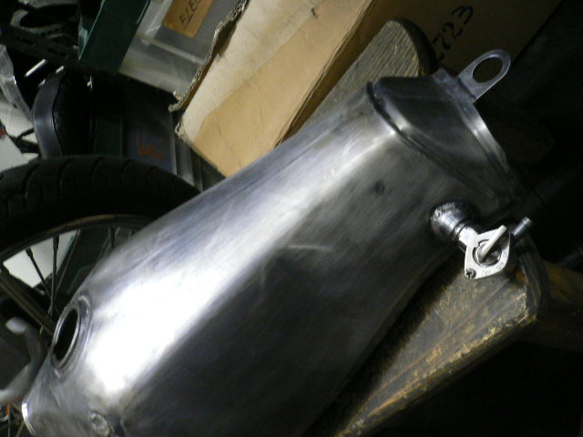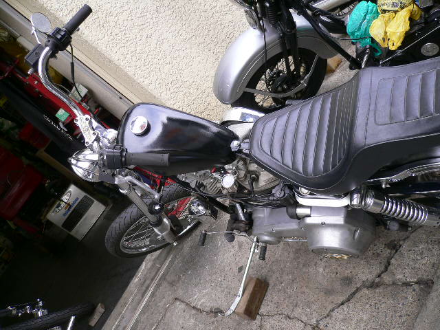 ガソリンタンクの加工を終えて、漏れがないか点検中です。もともと、小さくてガソリンの入る量が少ないタンクなので、コックの位置ももちろん移動しました。