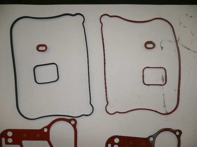 純正のガスケットキットを注文しましたが、材質がアップデートされていて、色も今までの物と違います。写真右が、今回、外したフニャフニャで、左が、これから組み込む新品です。触った感じも、かなり硬くなっています。