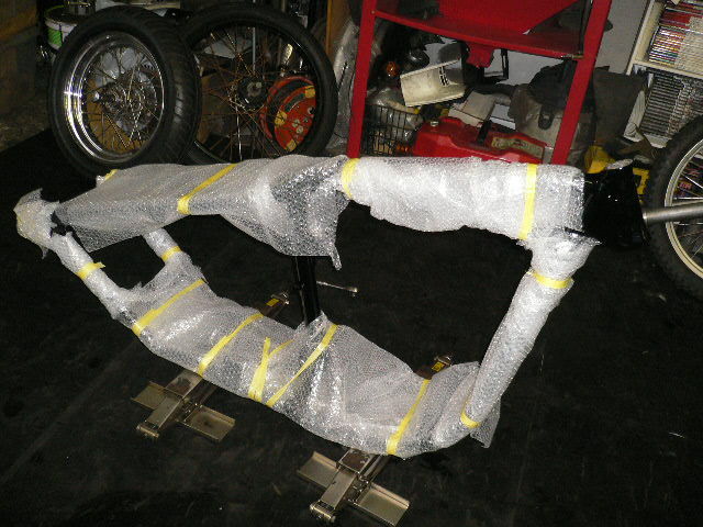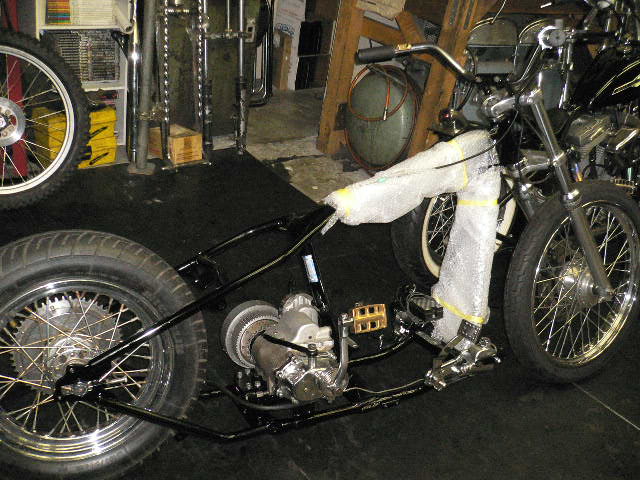 お待たせしている、panhead customのフレームが塗装(パウダーコート)から帰ってきたので、とりあえず前後の足廻りを組み付けて、取り回し出来るようにしました。フレーム以外の塗装はもうしばらくお待ちください。