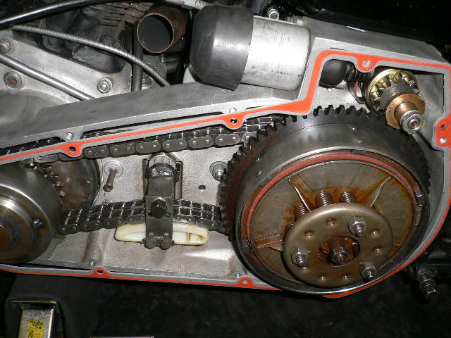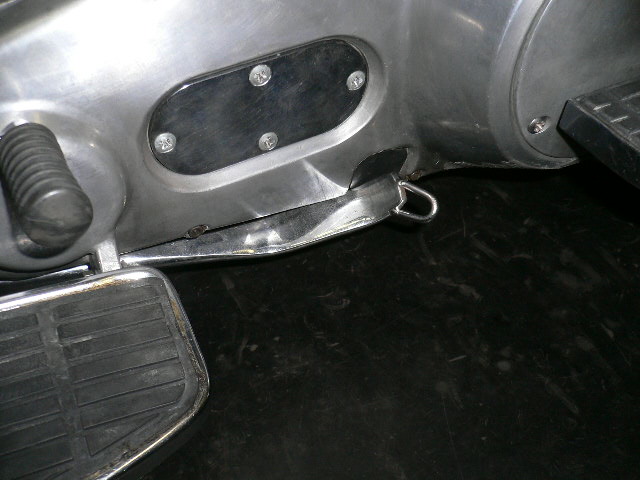 ショベルのプライマリカバーのサイドスタンドが当たる所には、本来、ゴム板が付きます。これが無いまま、長期間に渡ってサイドスタンドを跳ね上げるたびにカツンッ、とやっていると、しまいにはプライマリカバーにヒビが入ります。プライマリカバー付きのショベルオーナーは、お気をつけ下さい。