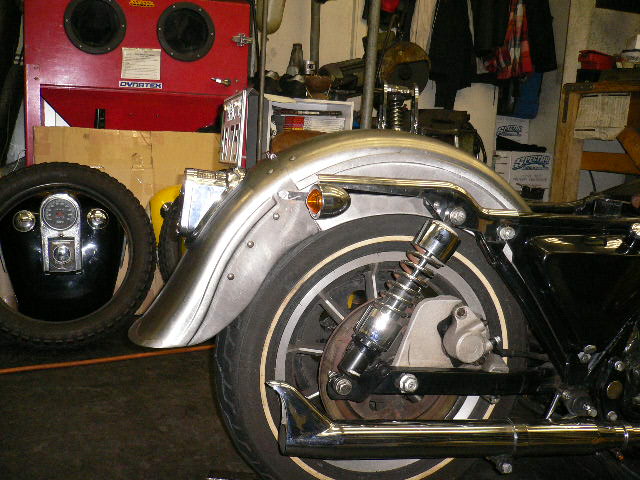 リヤフェンダーをあてがってみています。このフレームに取り付けるようには出来ていないので、いろいろと加工が必要になります。