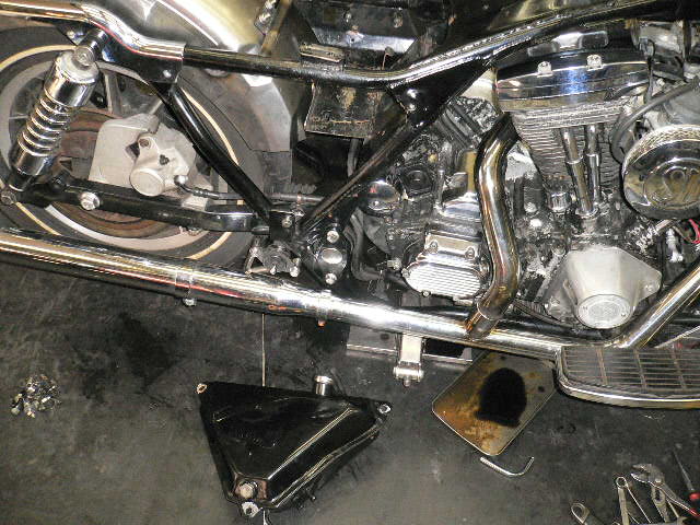 オイルライン引きなおしの為に、このフレームの特徴でもある三角のオイルタンクを外しています。この部分だけ見ると、FXRにも似ていますが、ちょっと違います。