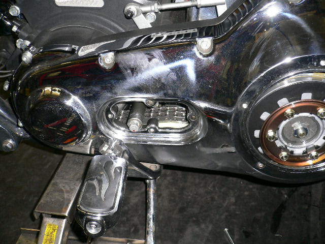 車検を受けて、各オイル交換中。プライマリーチェーンの張りを点検したところ、たるみが少し多いので、調整しておきます。